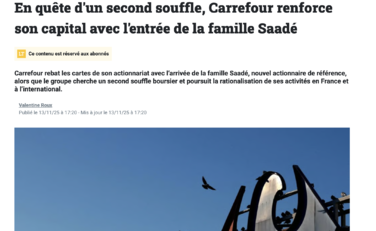 Article pour La Tribune, où l’on s’interroge sur la pertinence de l’investissement de la famille SAADE dans le groupe Carrefour malgré une faible valorisation boursière. Lire la suite